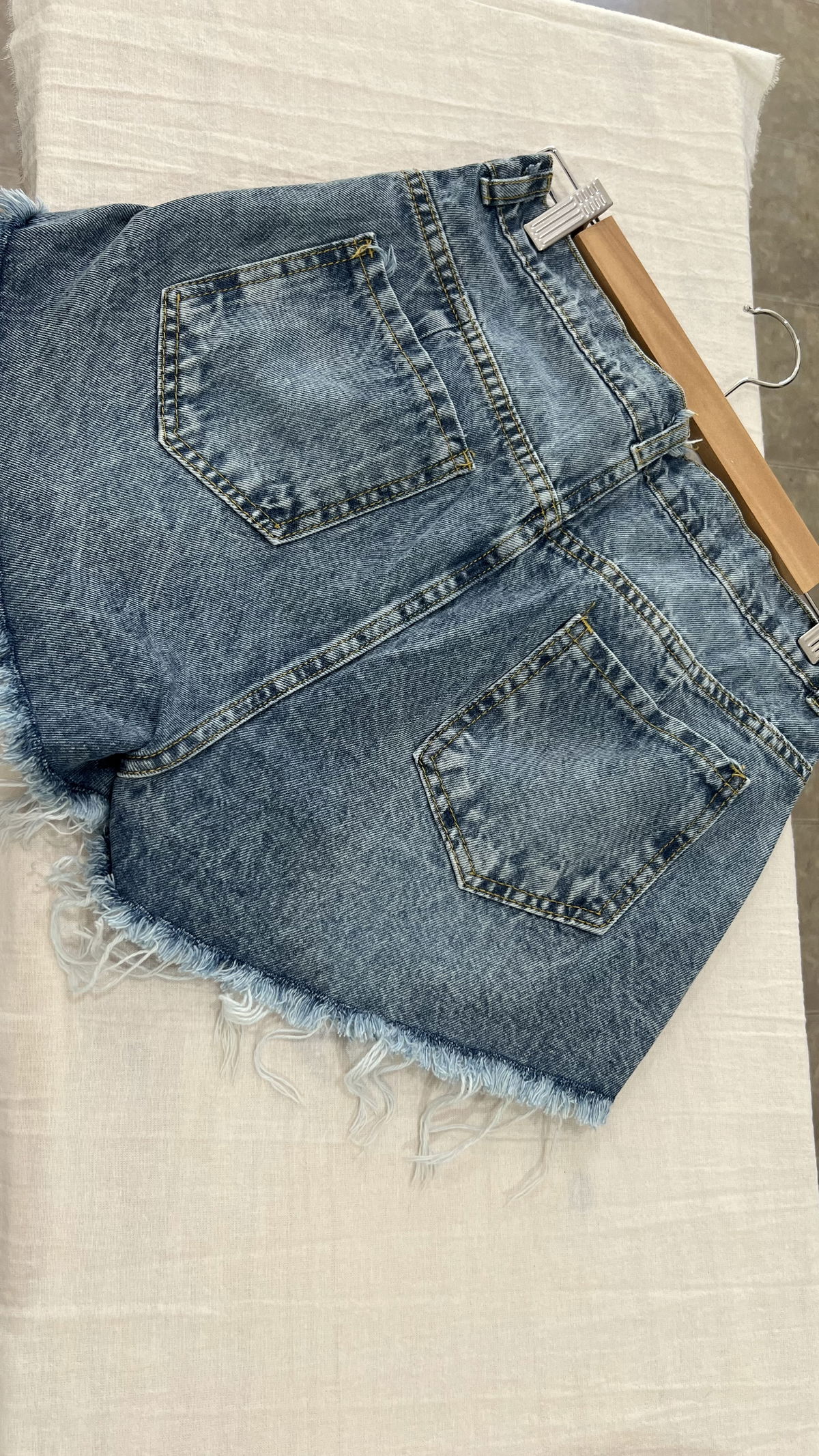 Short denim, celeste con bigotes, rigidos, deflecados.