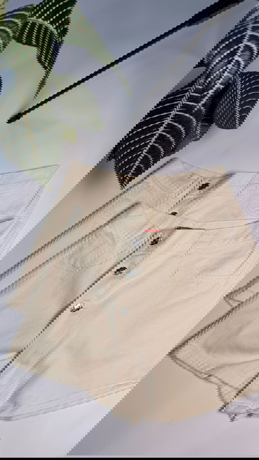 Skort Denim rígido, color natural, con botones a lo largo de la solapa.