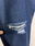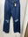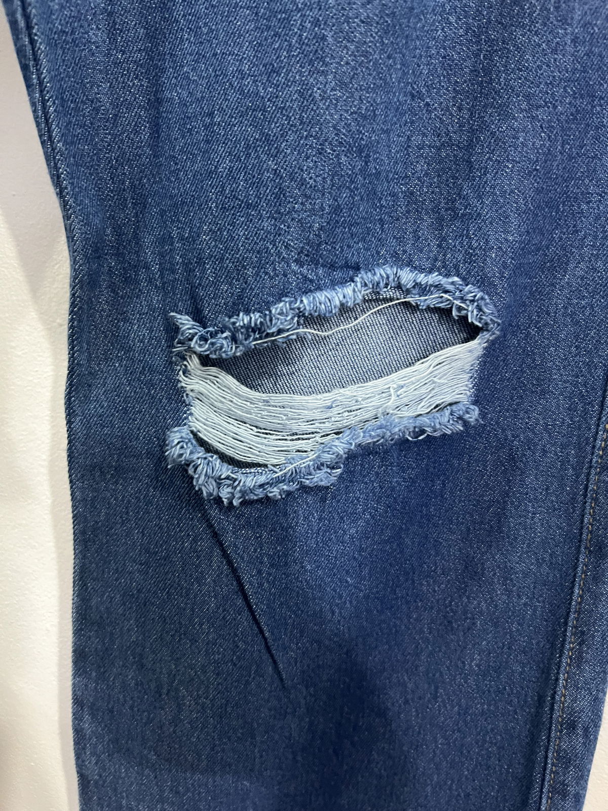 Jeans Wide Leg rígido azul, con roturas en las rodillas, bolsillos y pasa cinto.