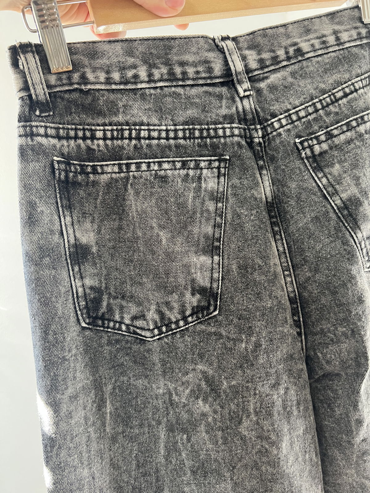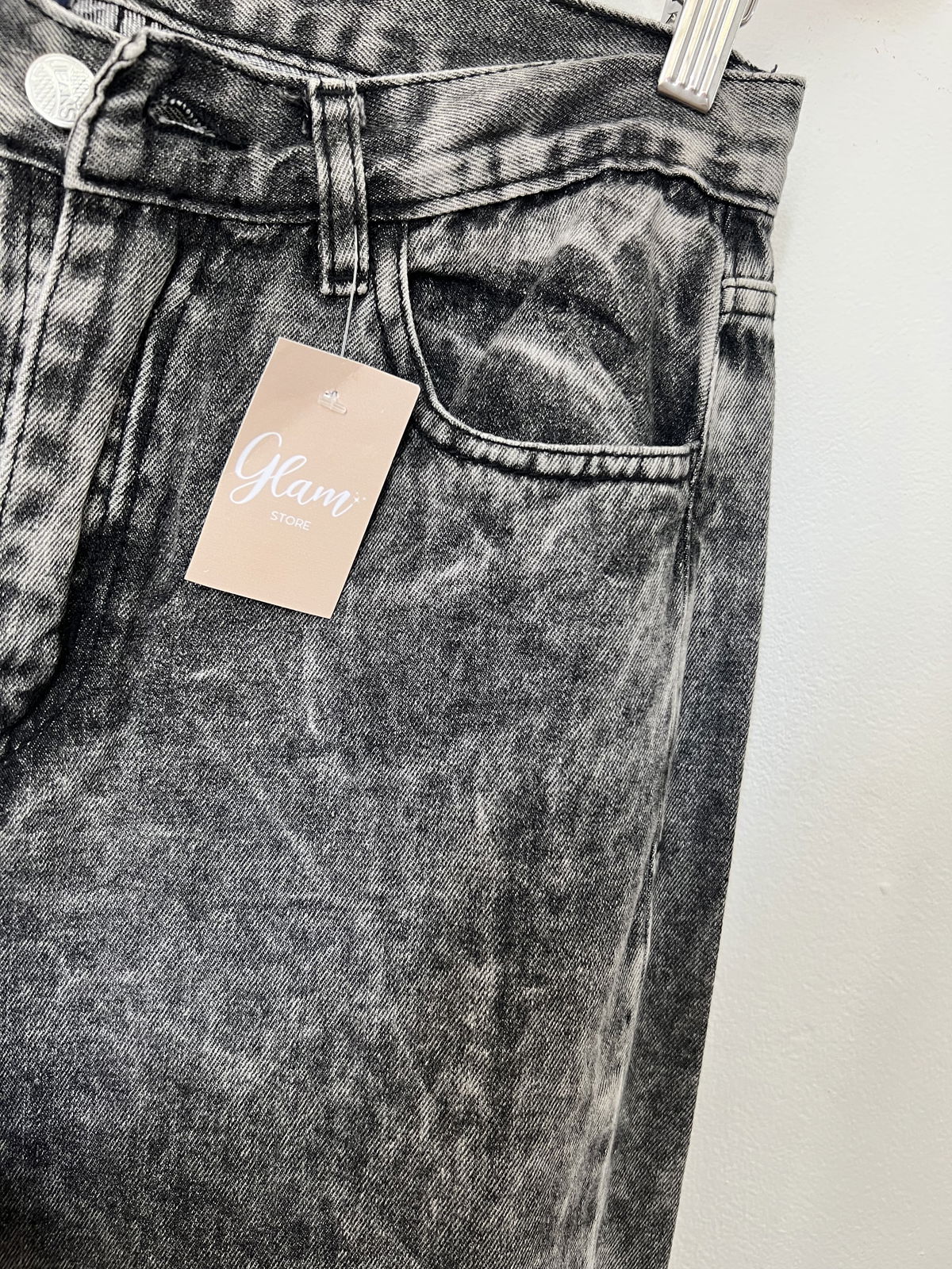 Jeans Wide Leg gris jaspeado rígido, con bolsillos y pasa cinto.