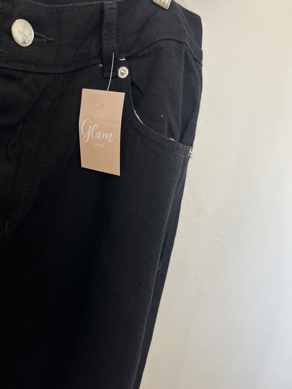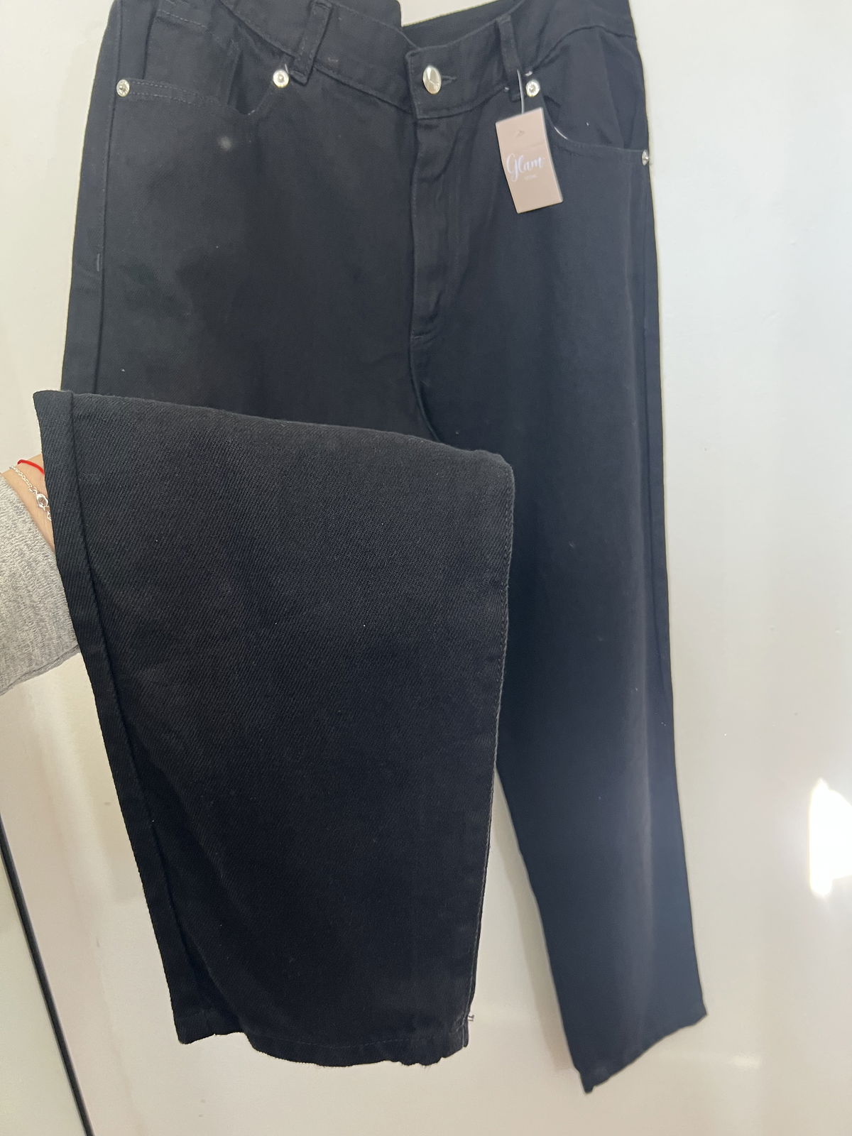 Jeans Mom Negro, rígido con bolsillos y pasa cinto.