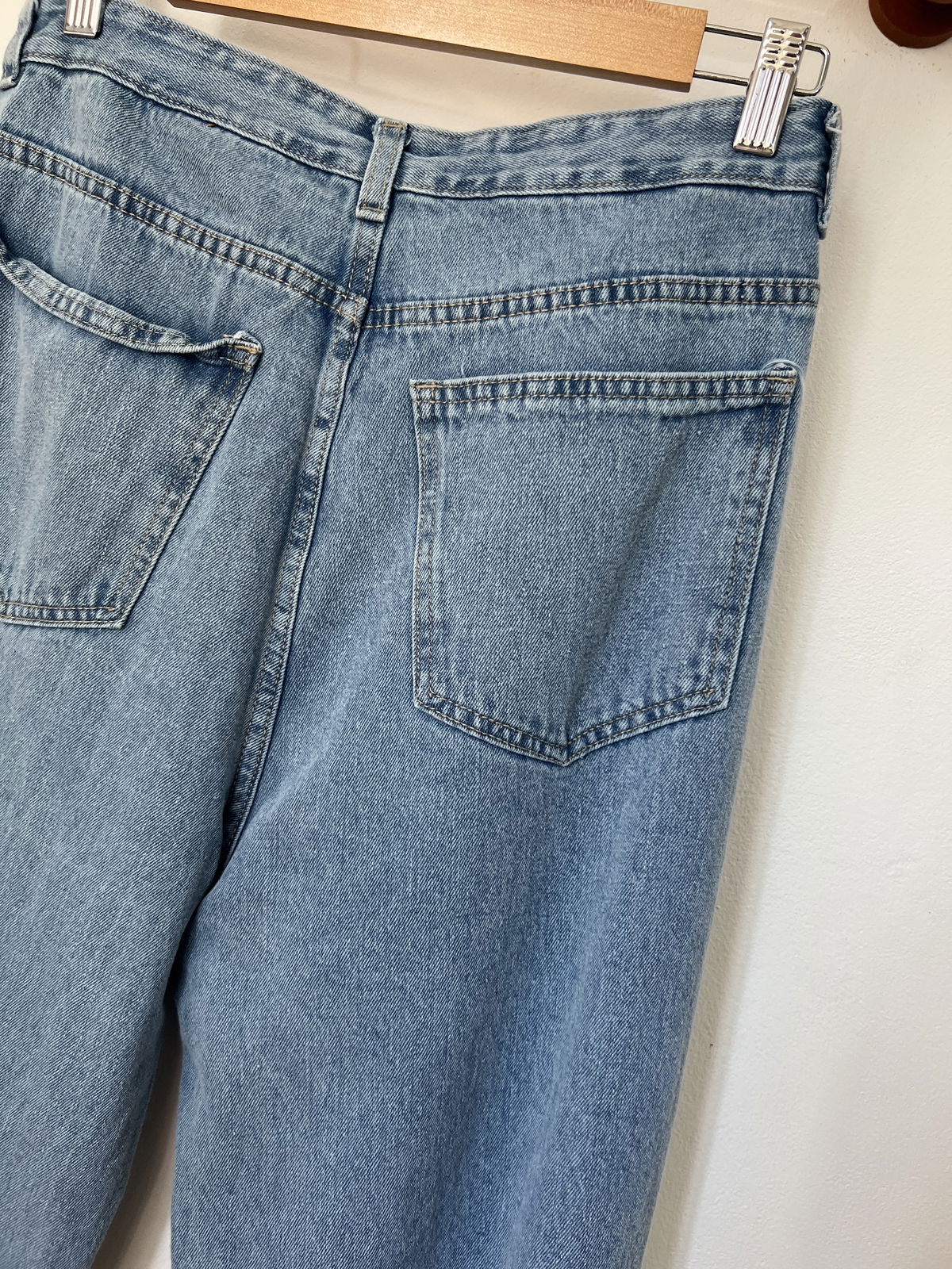 Jeans Wide Leg Celeste, rígido con bolsillos y pasa cinto.