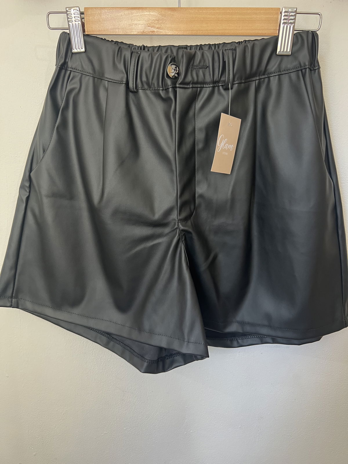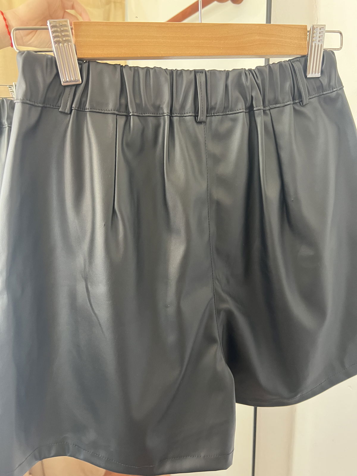 Shorts Engomado Negro con pinzas. Ademas tiene bolsillos delanteros, cierre y botón.