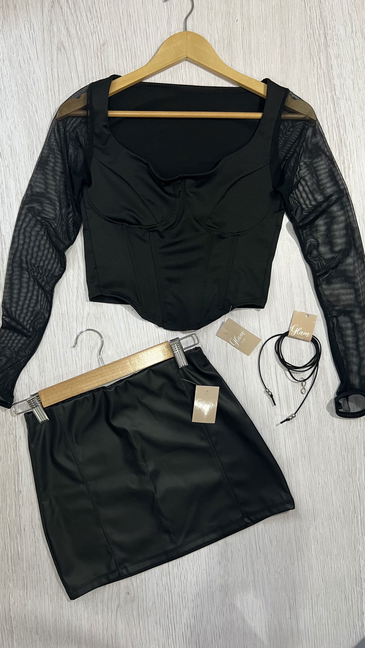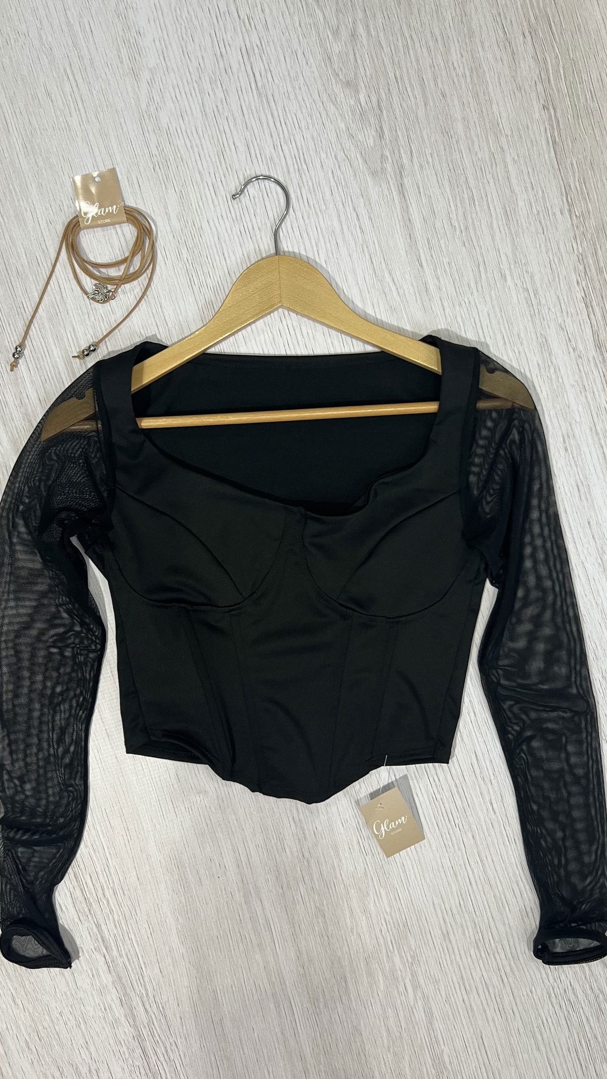 Tops Corset Negro de lycra con ballenitas y mangas de tul.