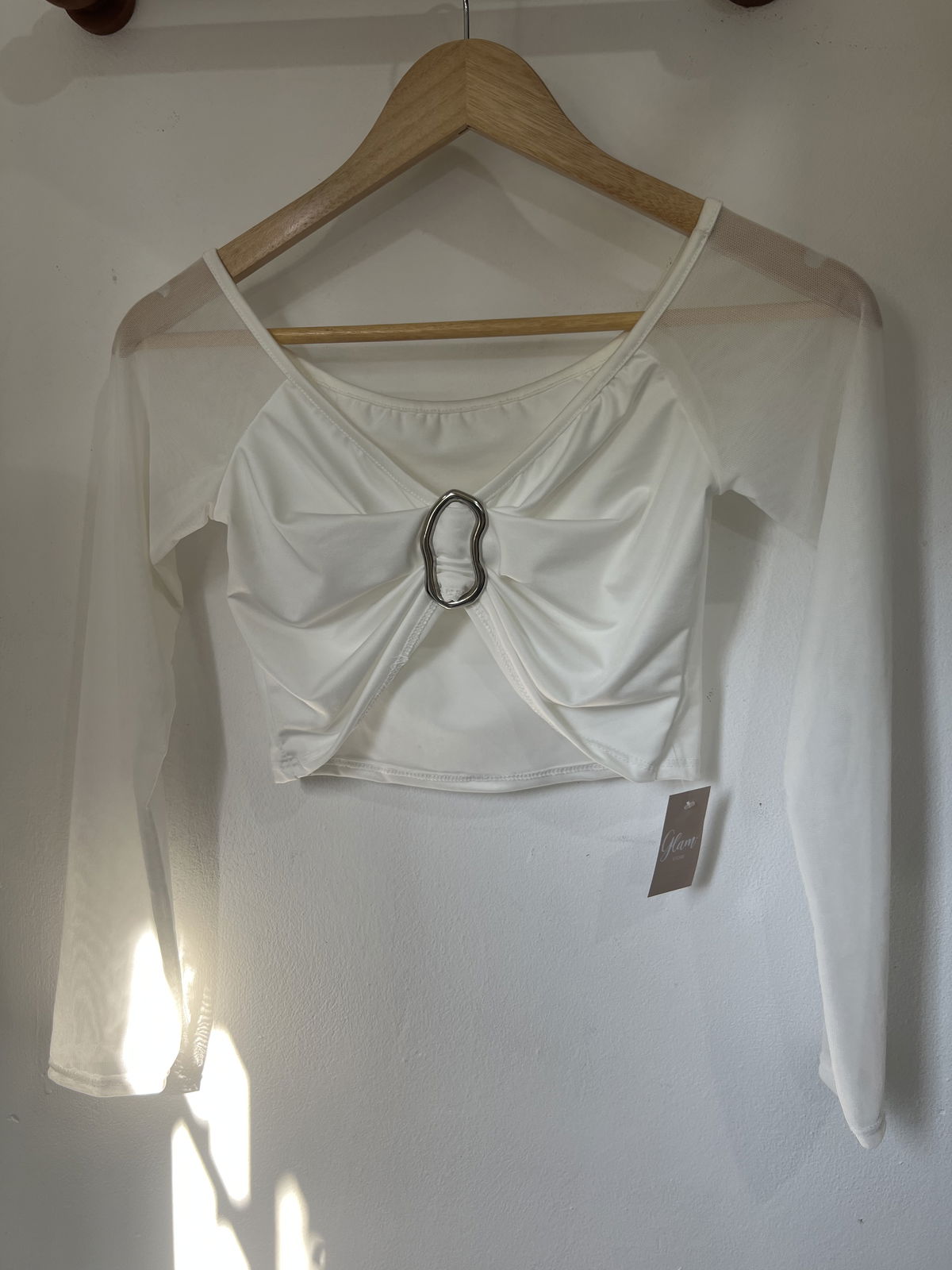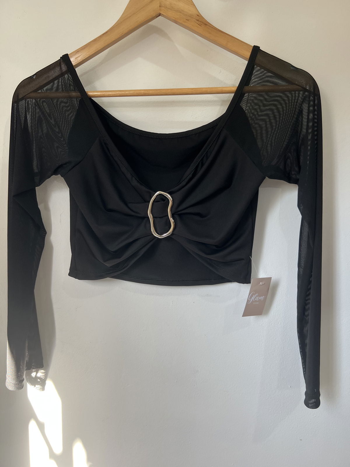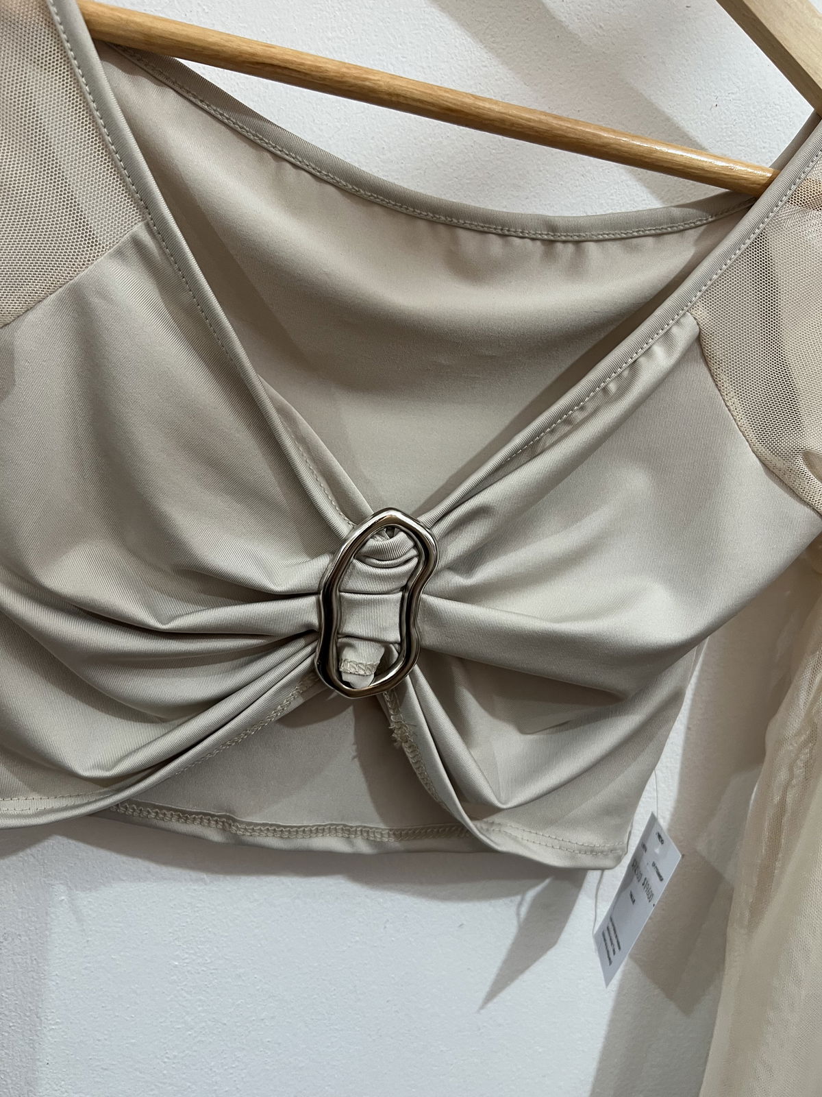 Top Triángulo de lycra con hebilla y mangas de tul.