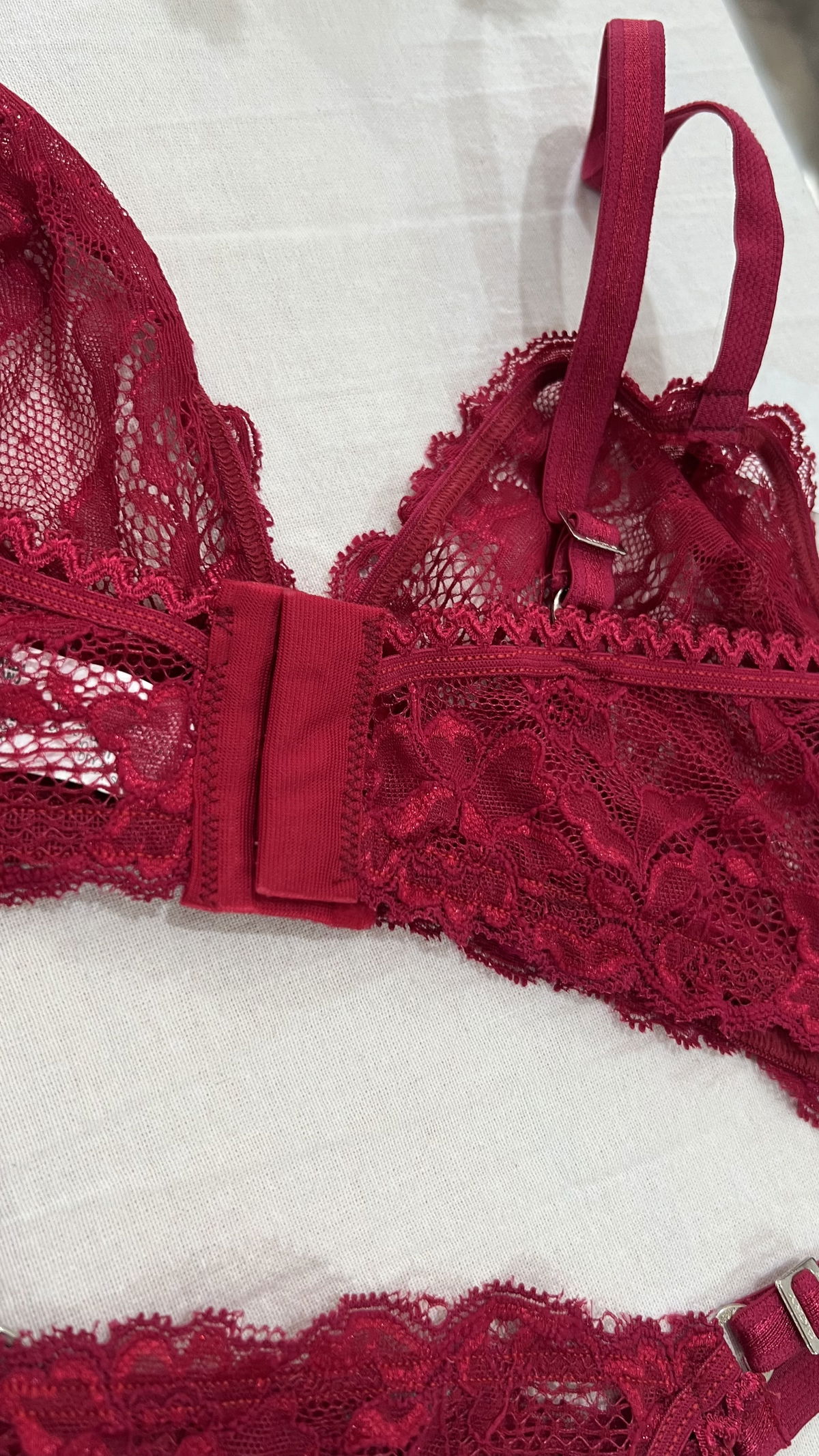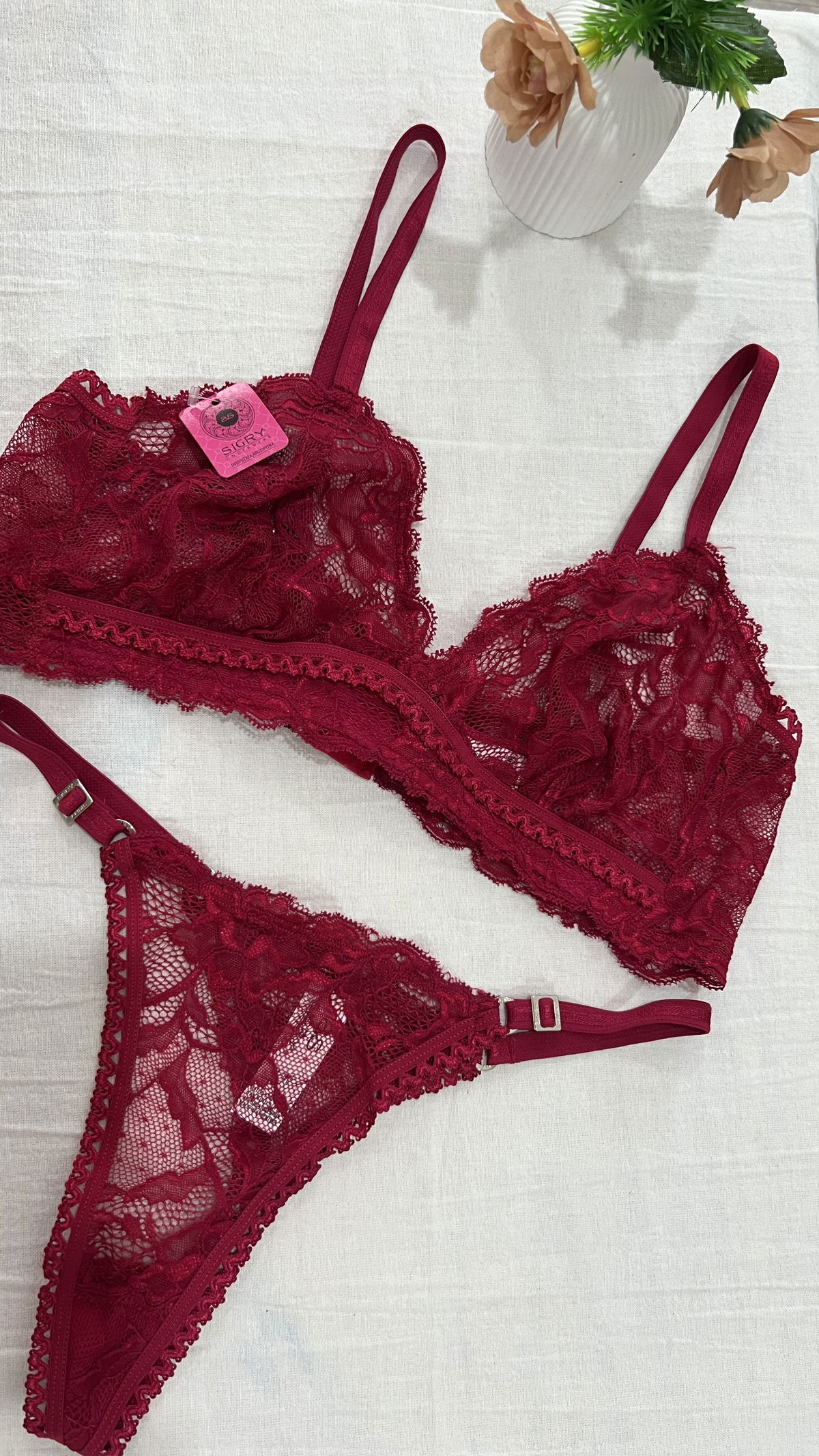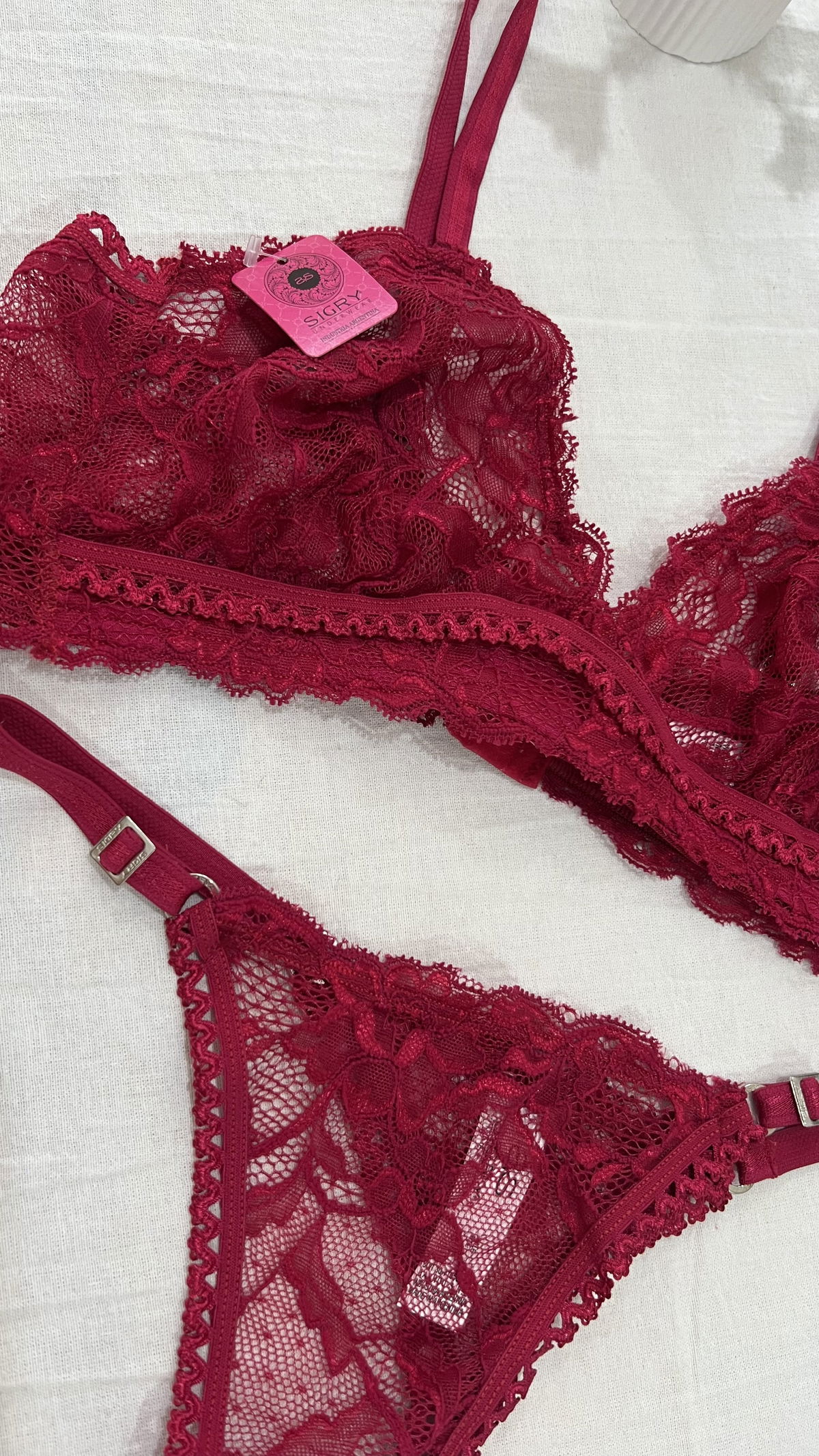 Conjunto Triangulo con less regulable, de encaje y puntilla.