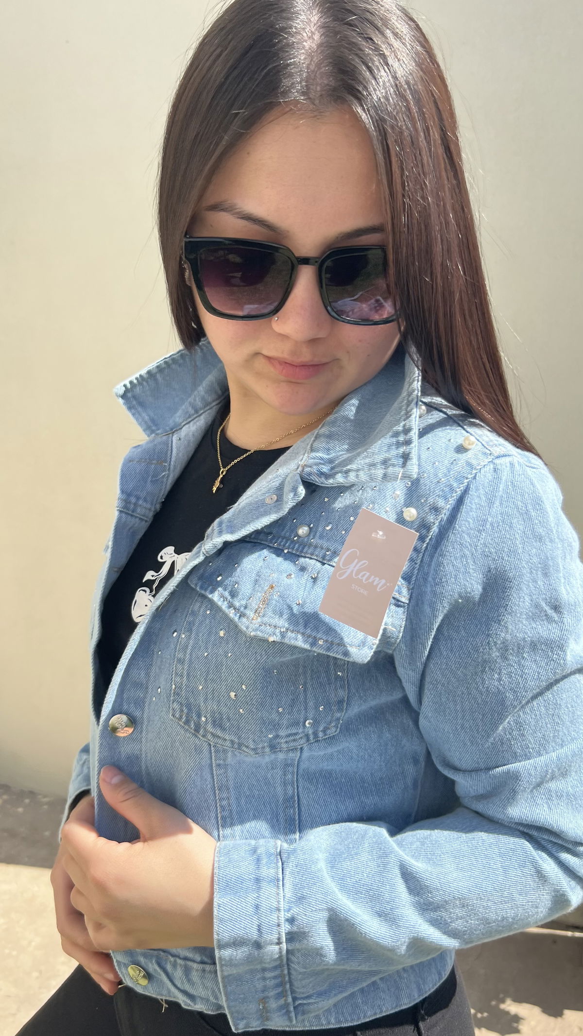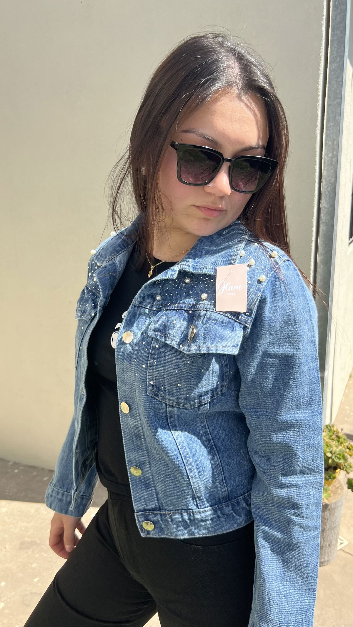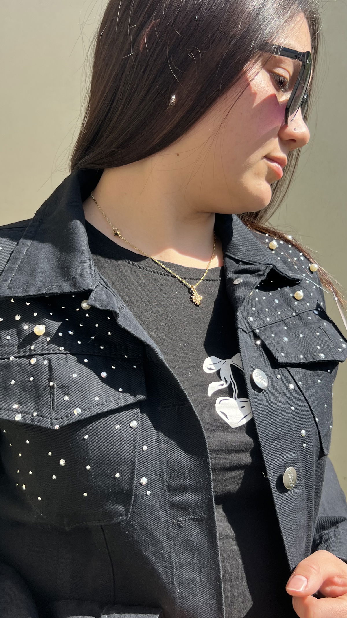 Campera de Jeans con detalles en hombros, strass y perlas.