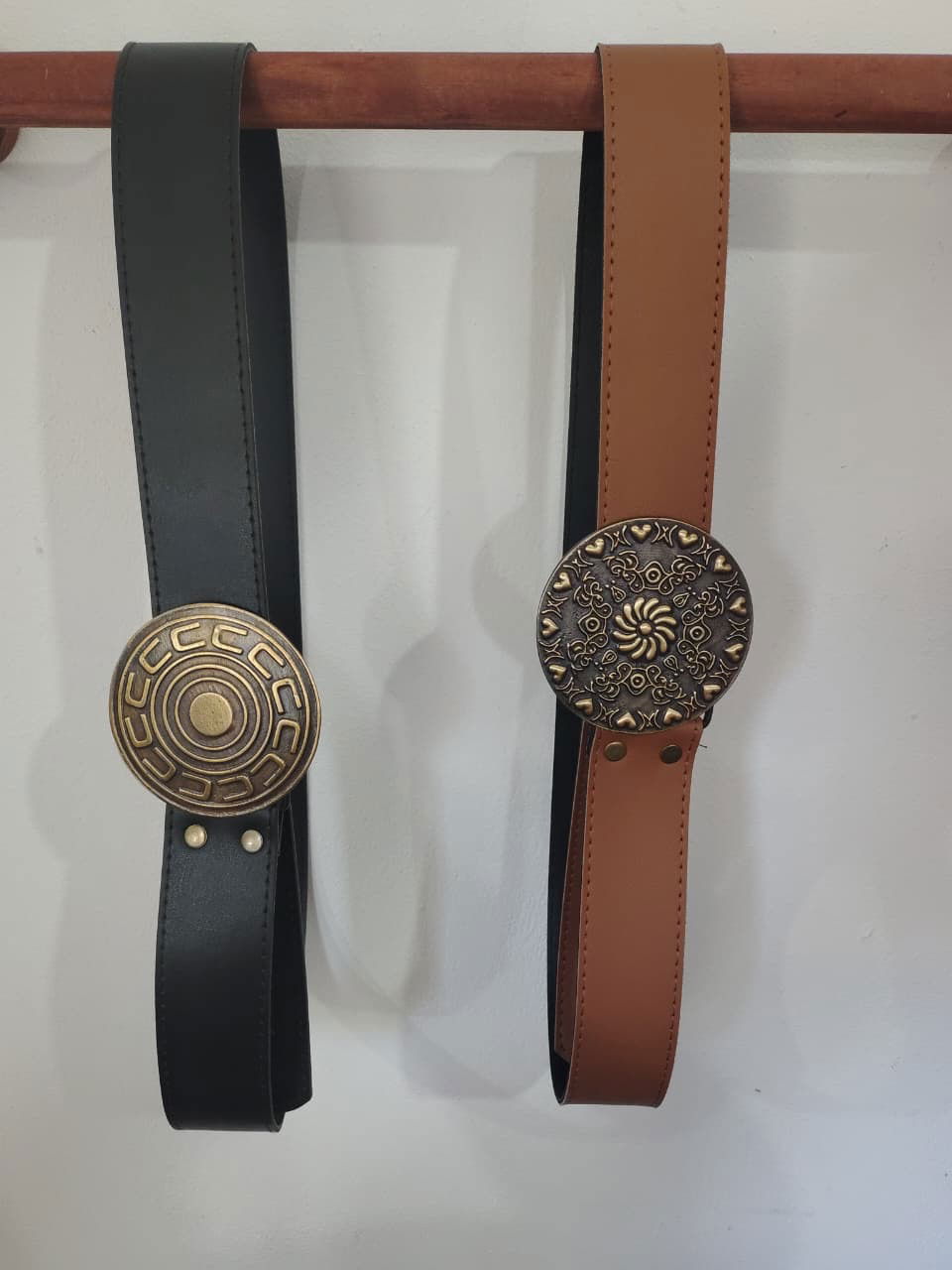 Cintos de eco cuero con hebilla redonda estilo chapón.