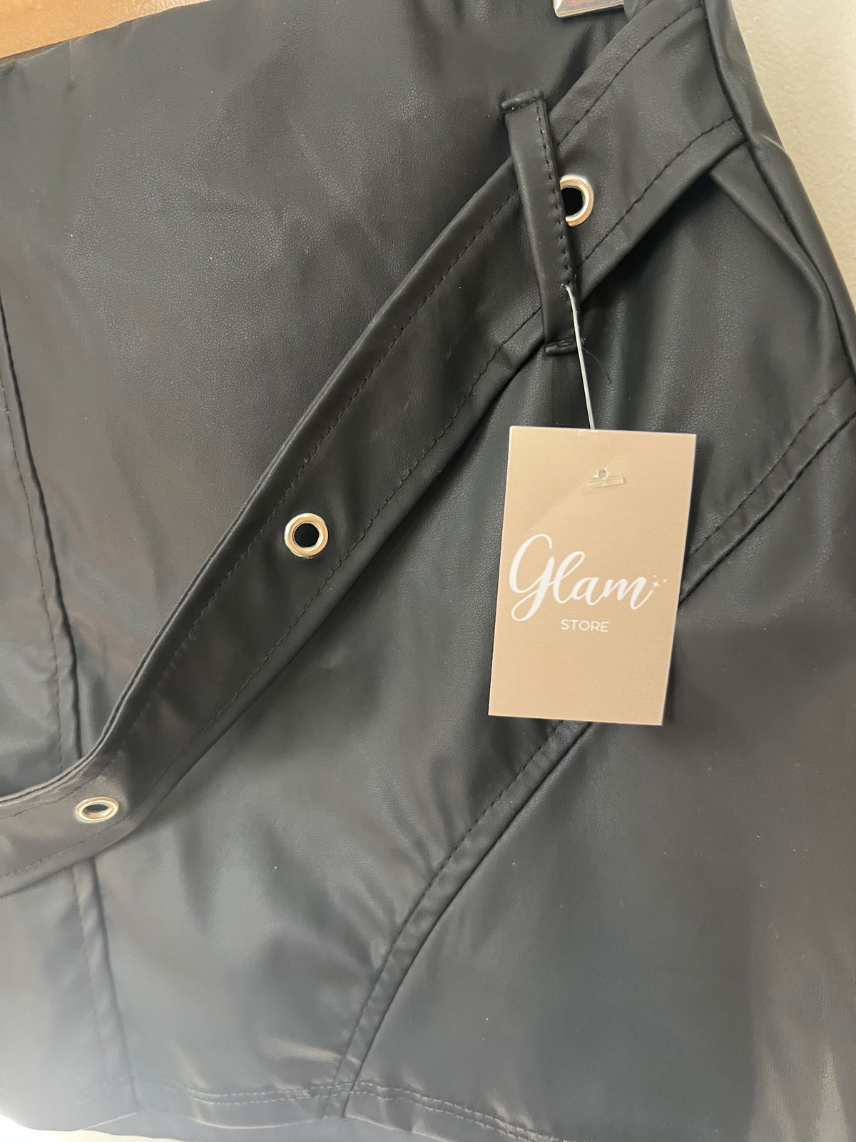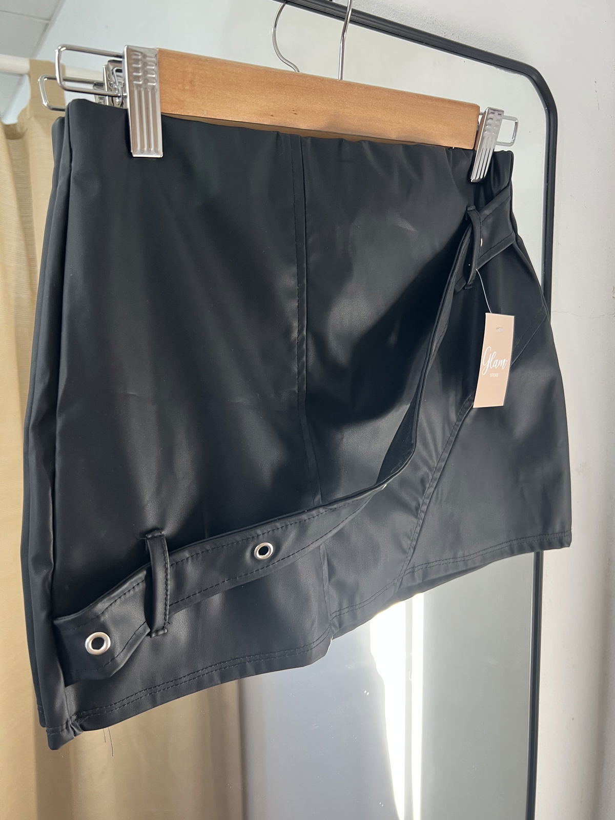 Pollera engomada negra con elastico en la cintura y detalle de tiras cruzadas.