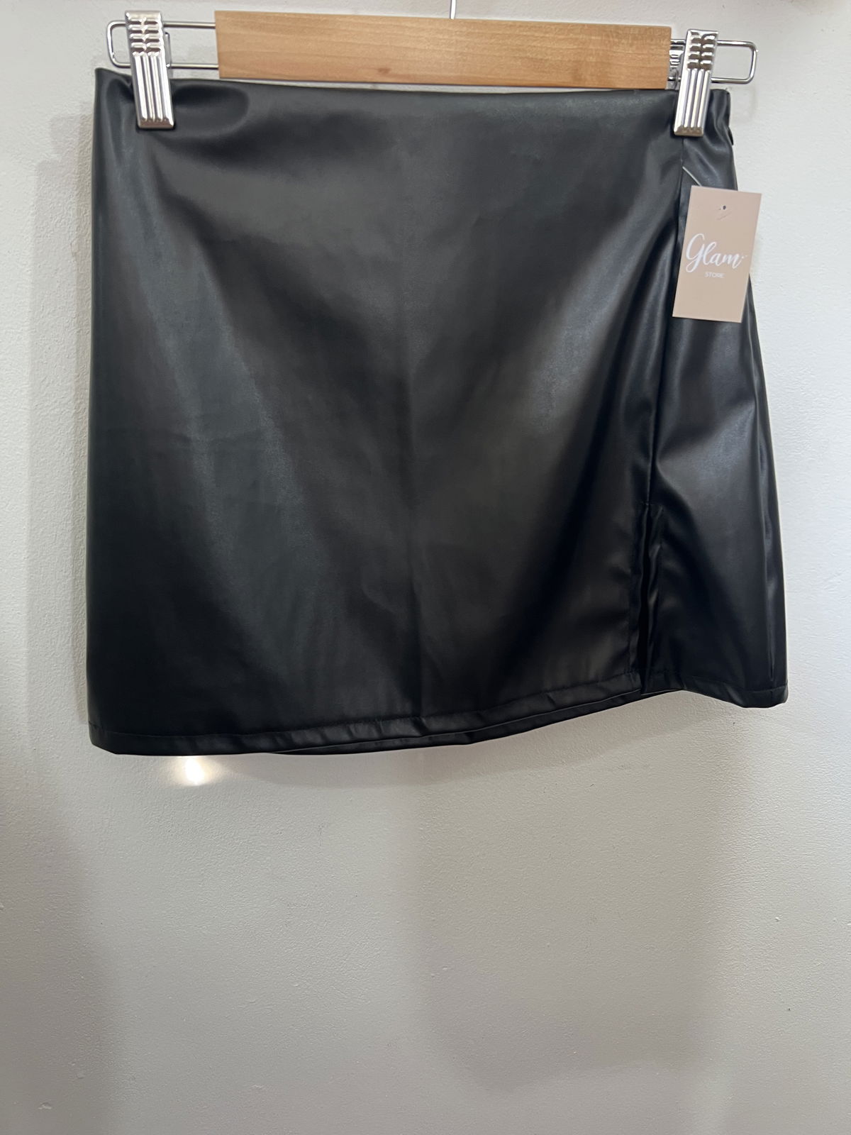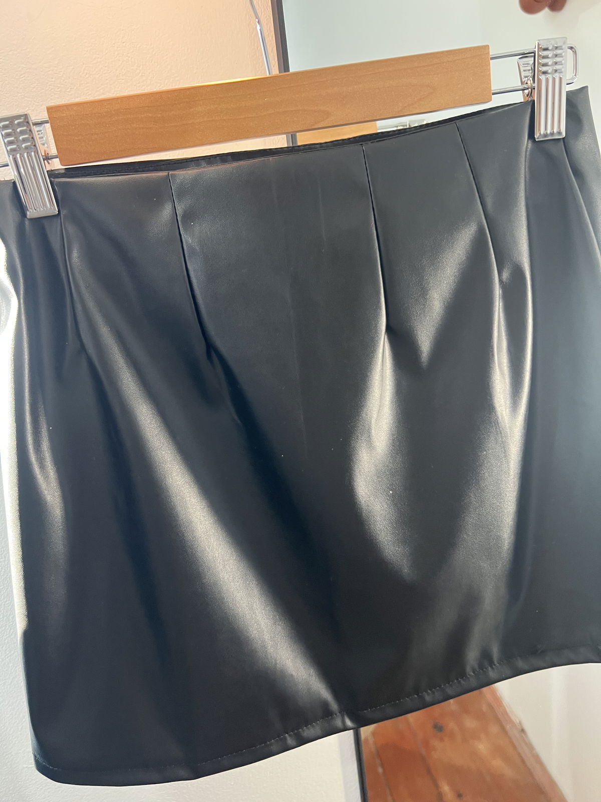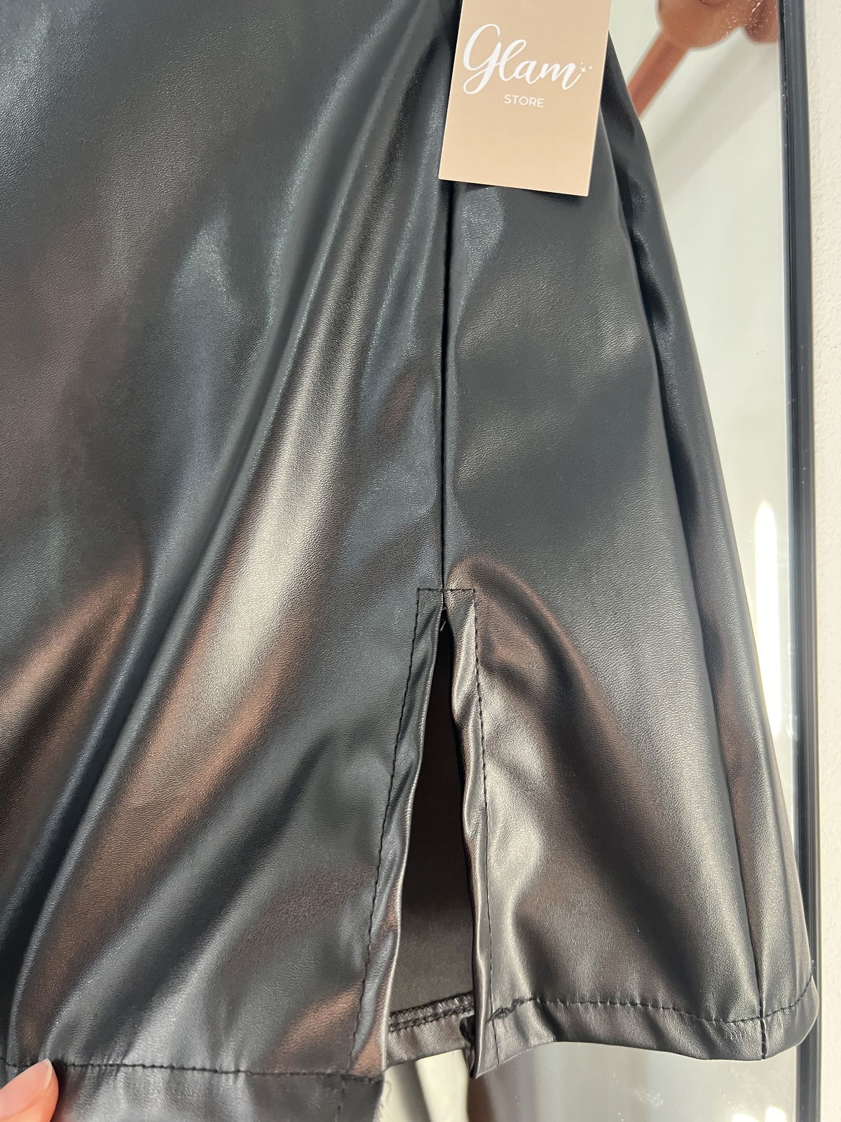 Pollera engomada negra, con cierre en el lateral de la cintura y tajo en un costado en el inferior.