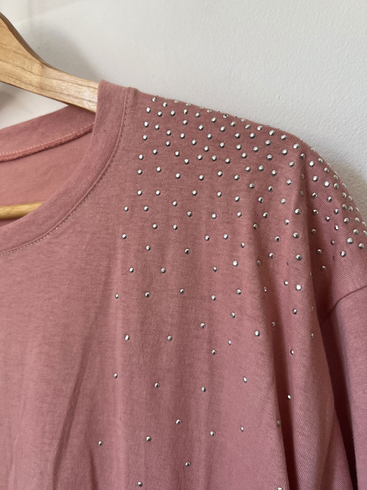 Remera de algodón jersey cuello redondo con detalles en strass en los hombros.