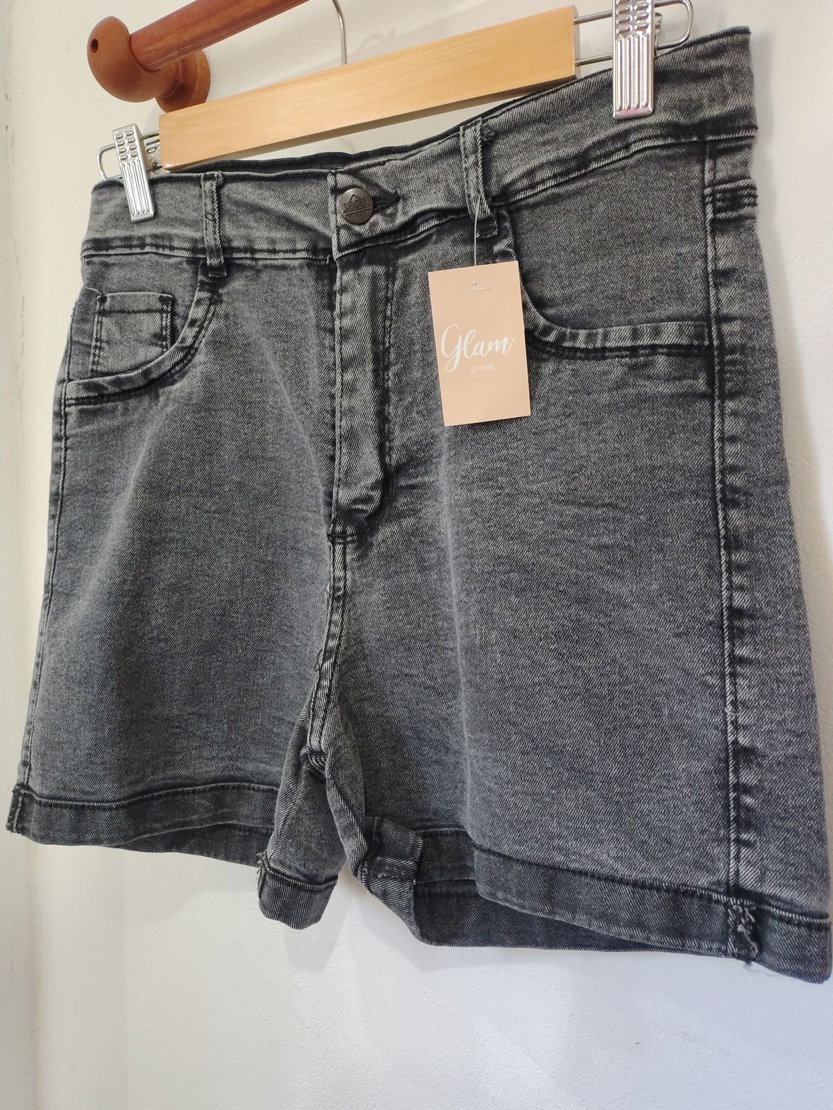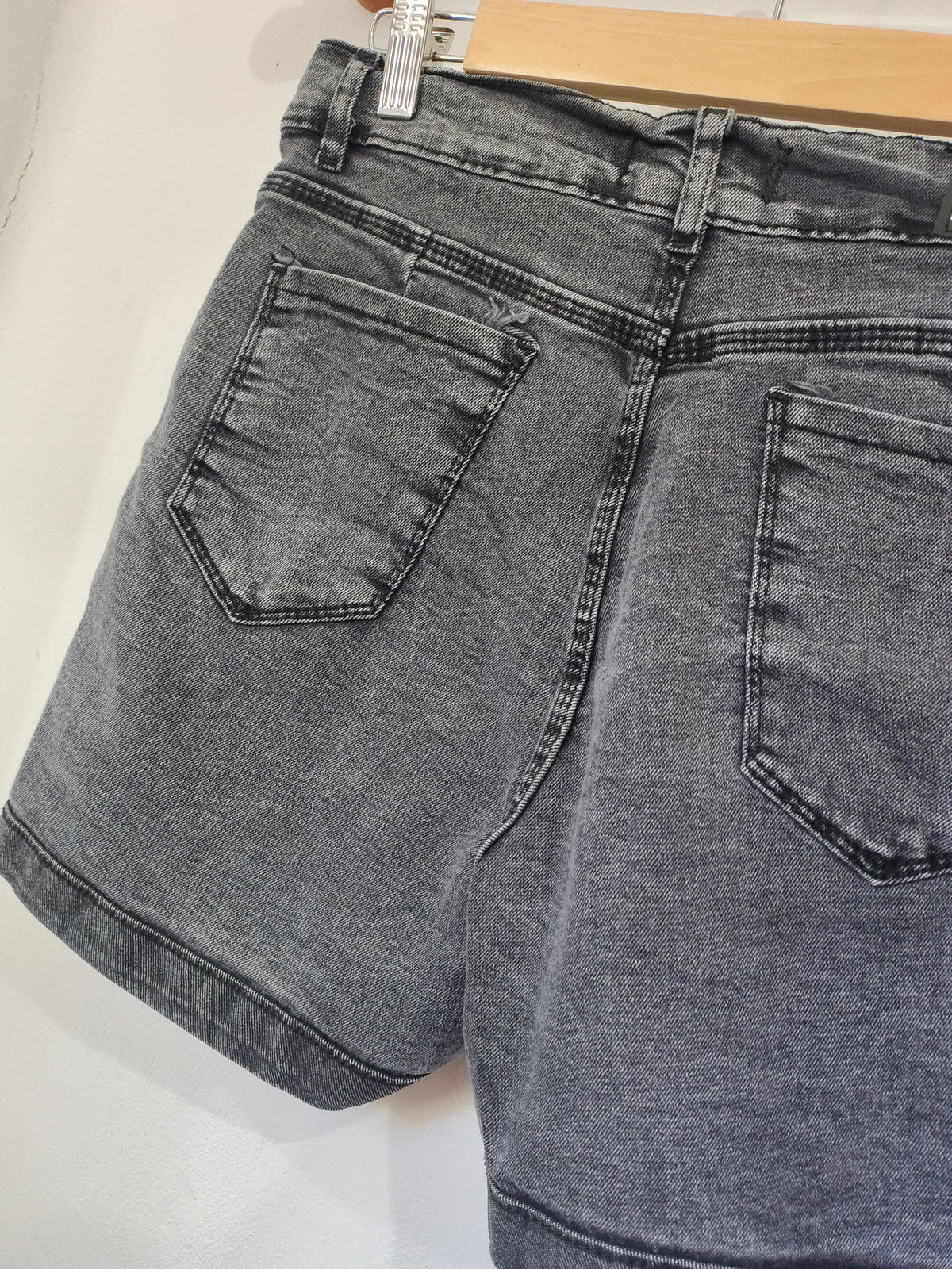 Shorts de jeans tiro alto, elastizado, gris oscuro.