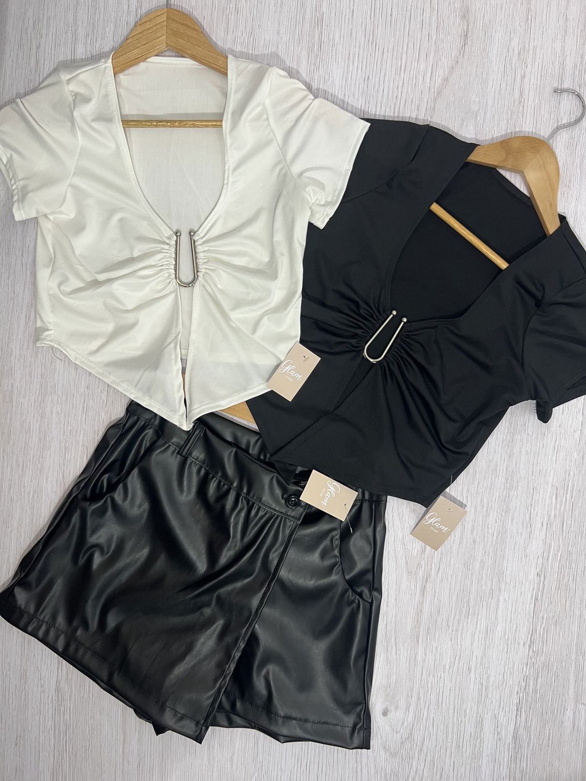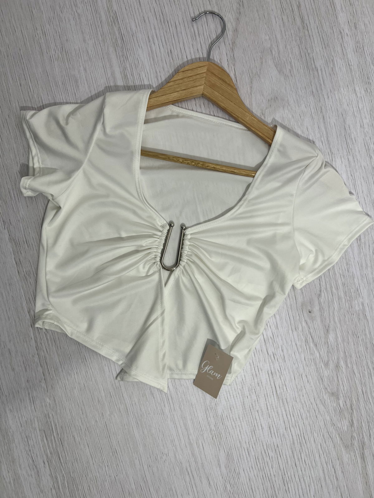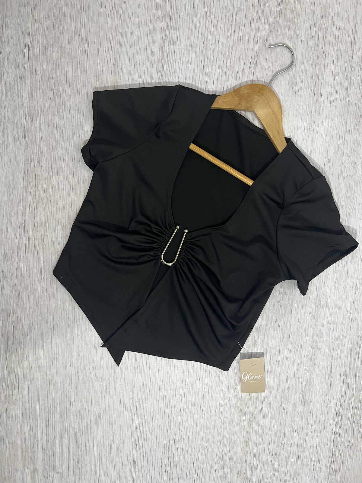 Top de lycra, mangas cortas con hebilla U en el escote.