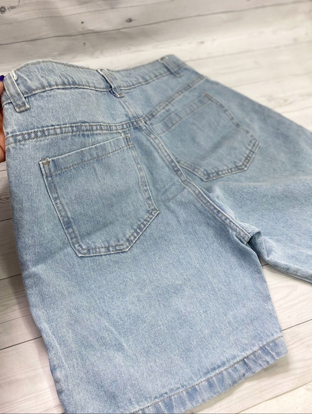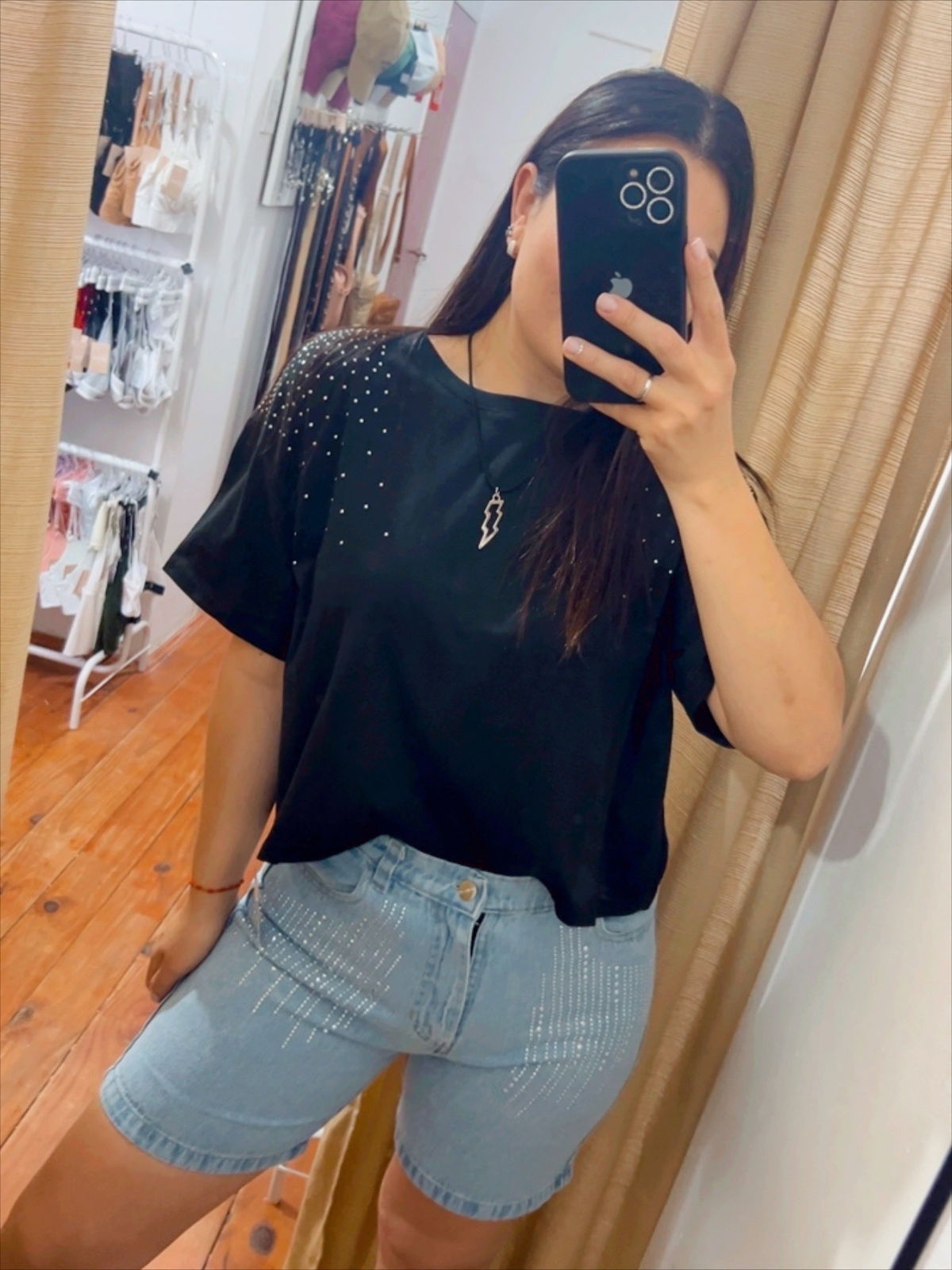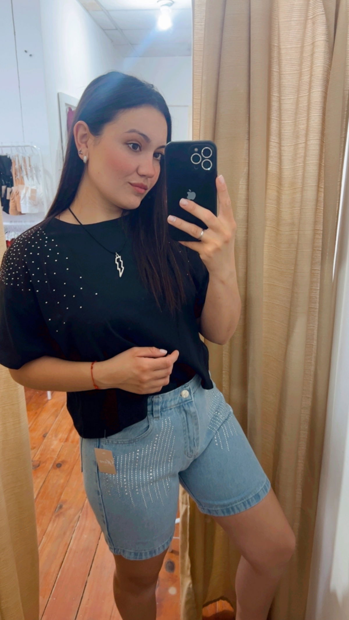 Bermuda Denim rígido, celeste claro con detalles en strass-