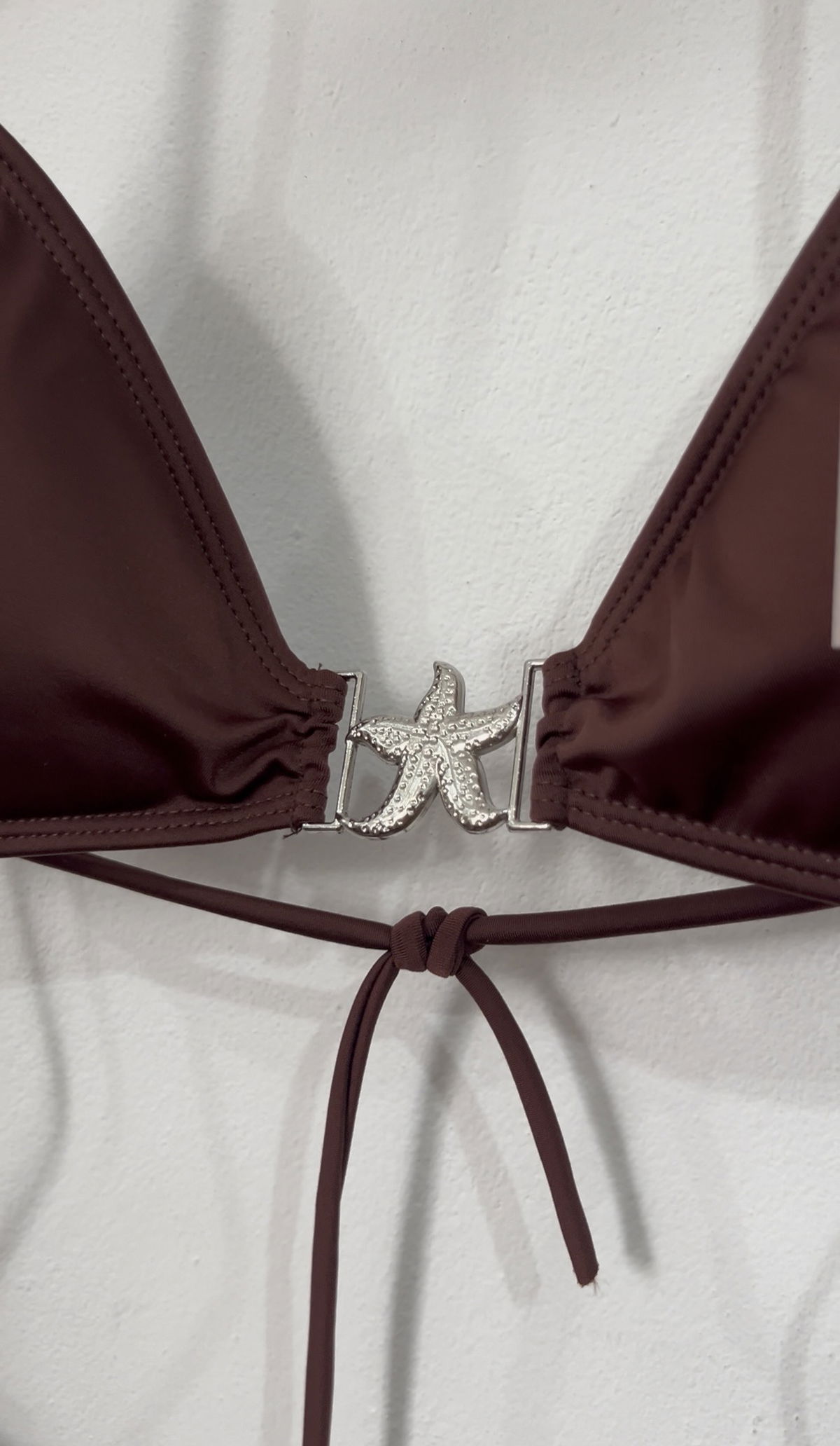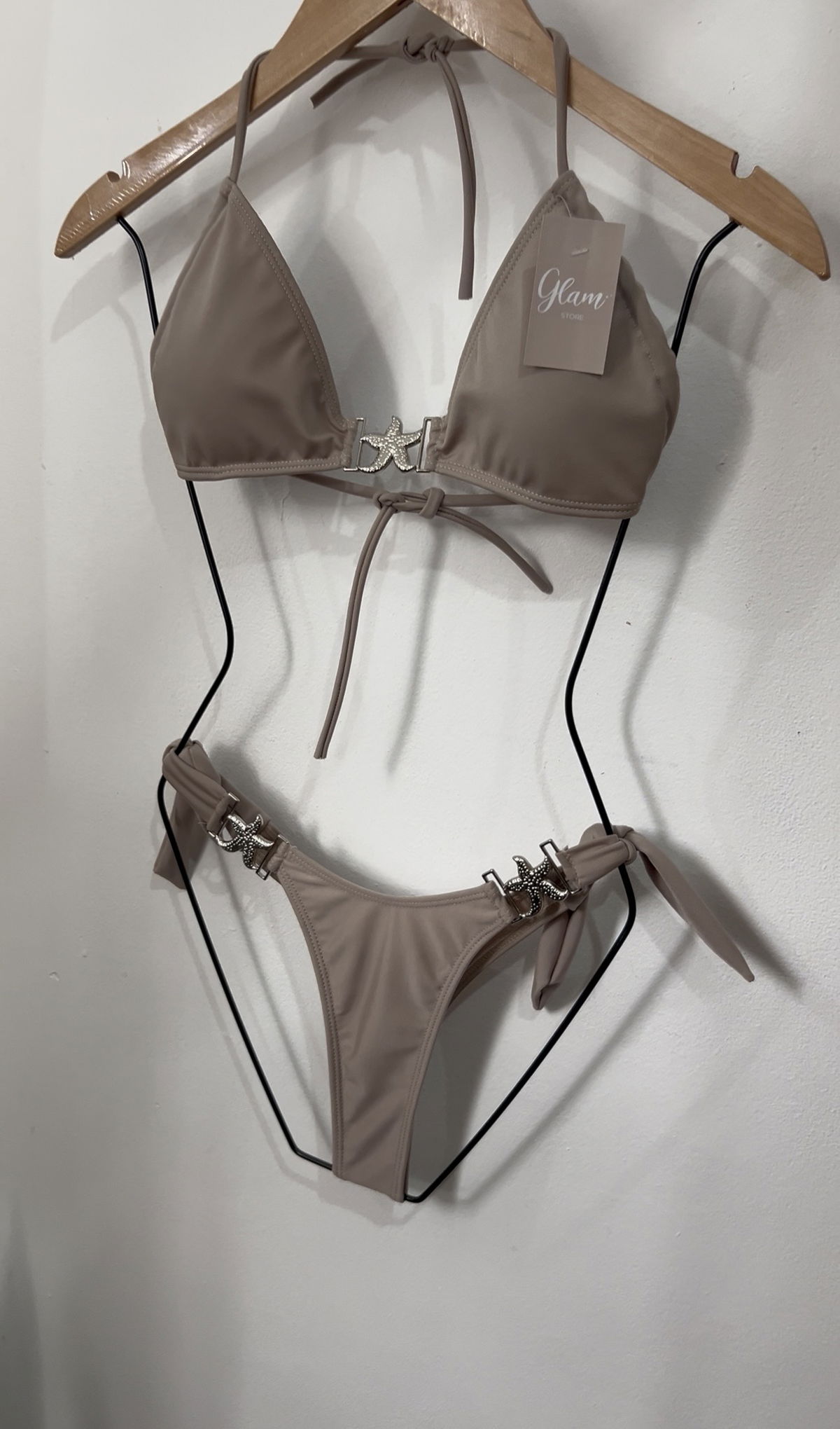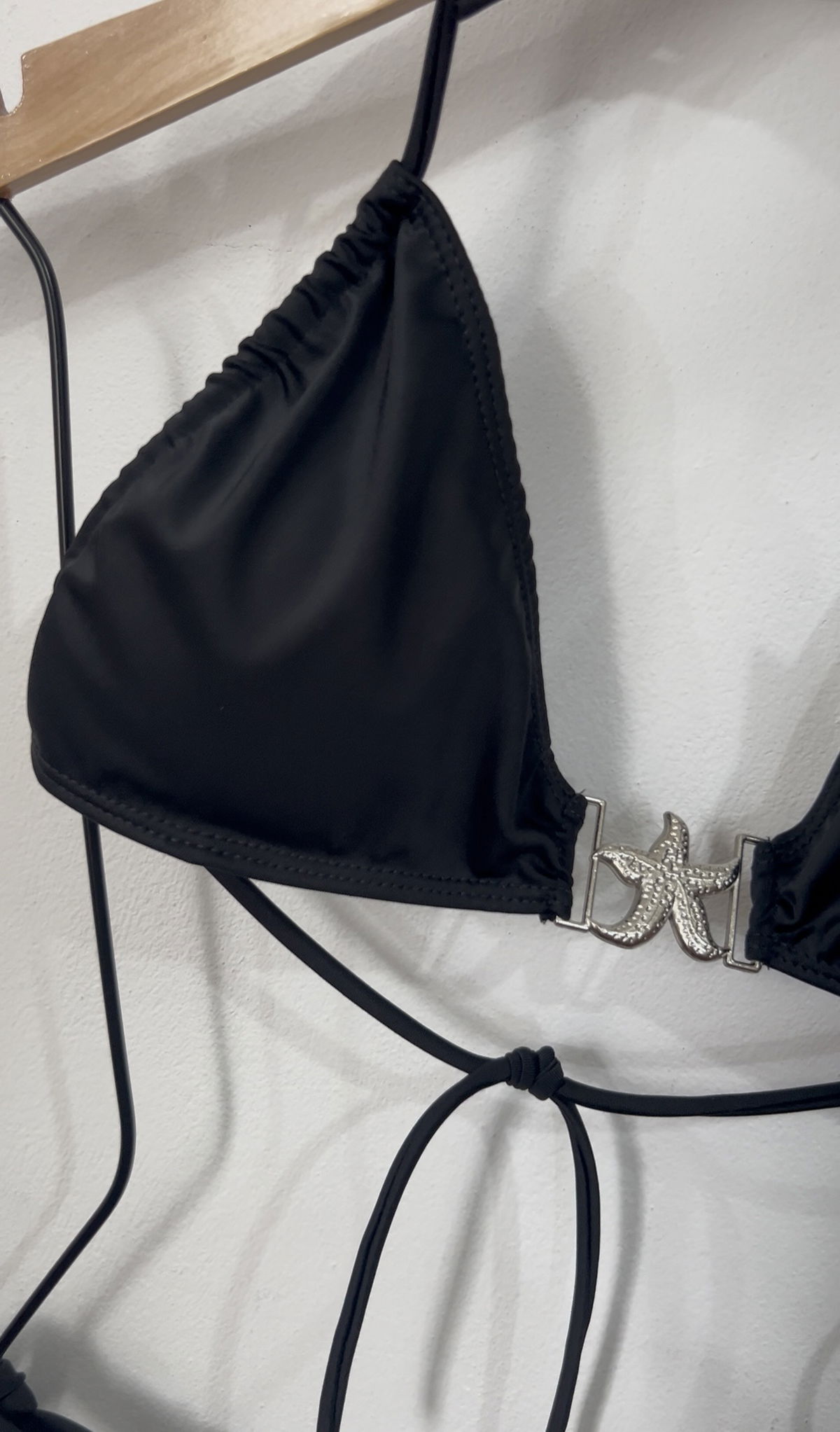 Bikini Buzios de lycra con tasa soft desmontable y less para atar en sus extremos. Avíos de estrellas, total vibras de playa ✨