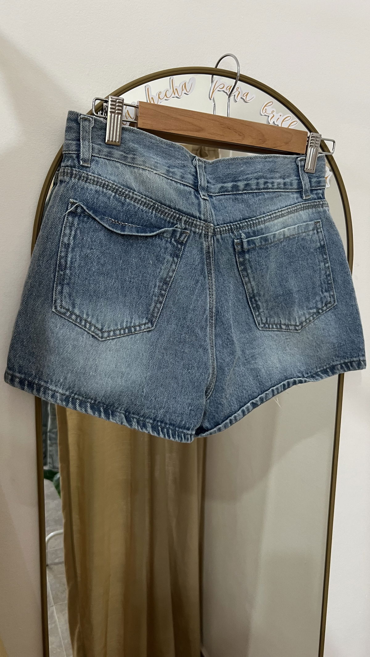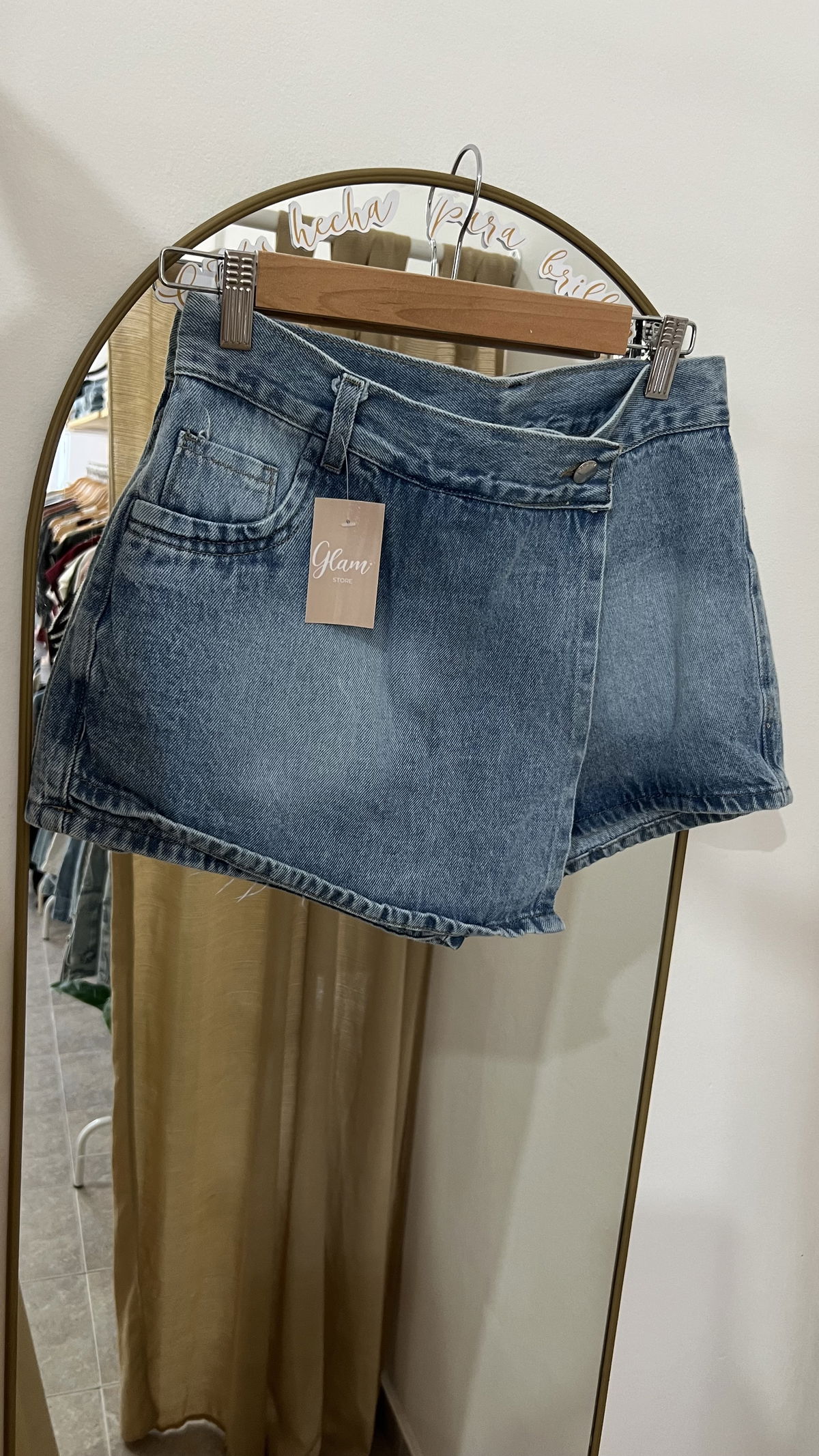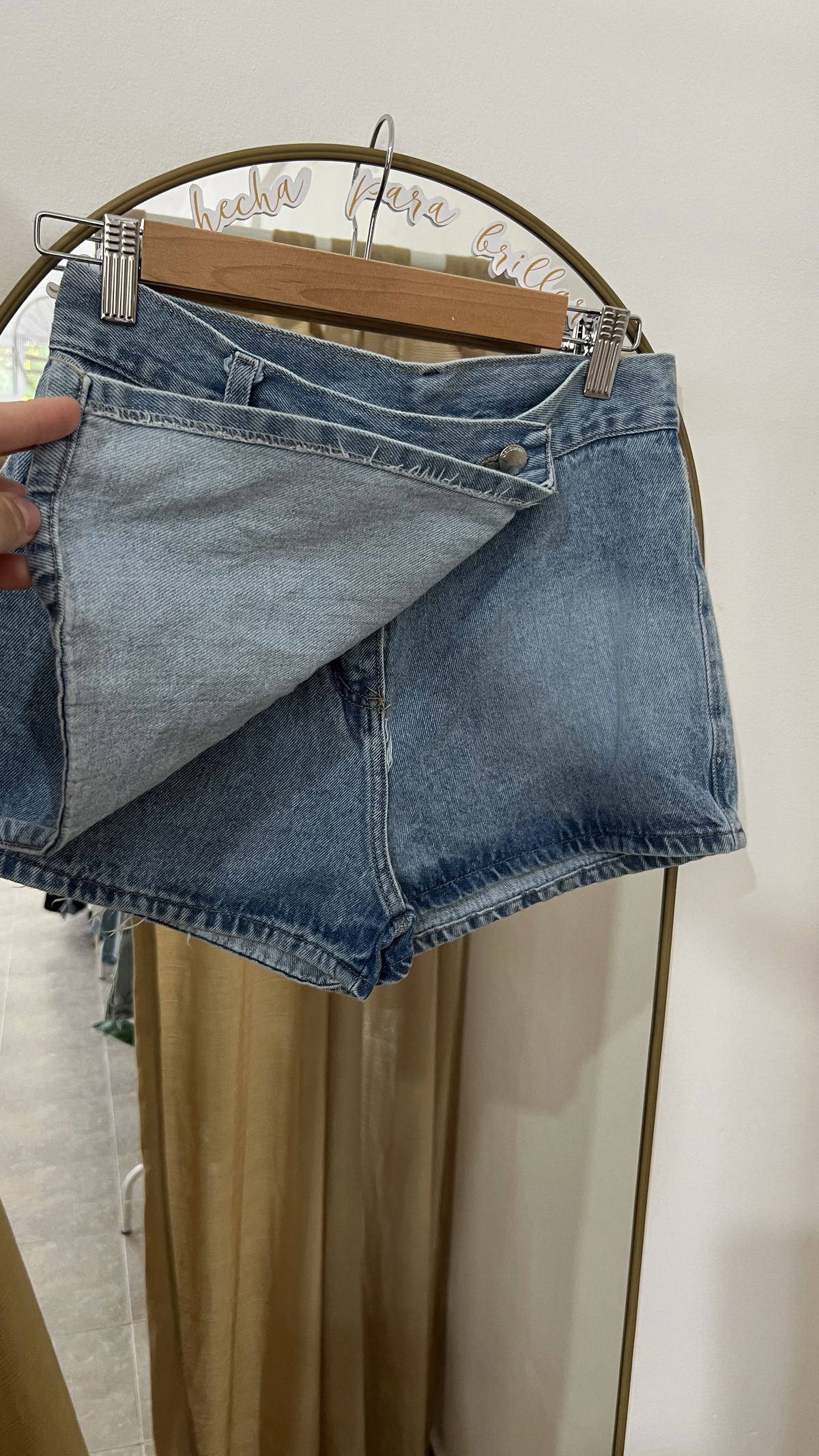 Skort Denim rígido celeste claro con solapa delantera con botones.