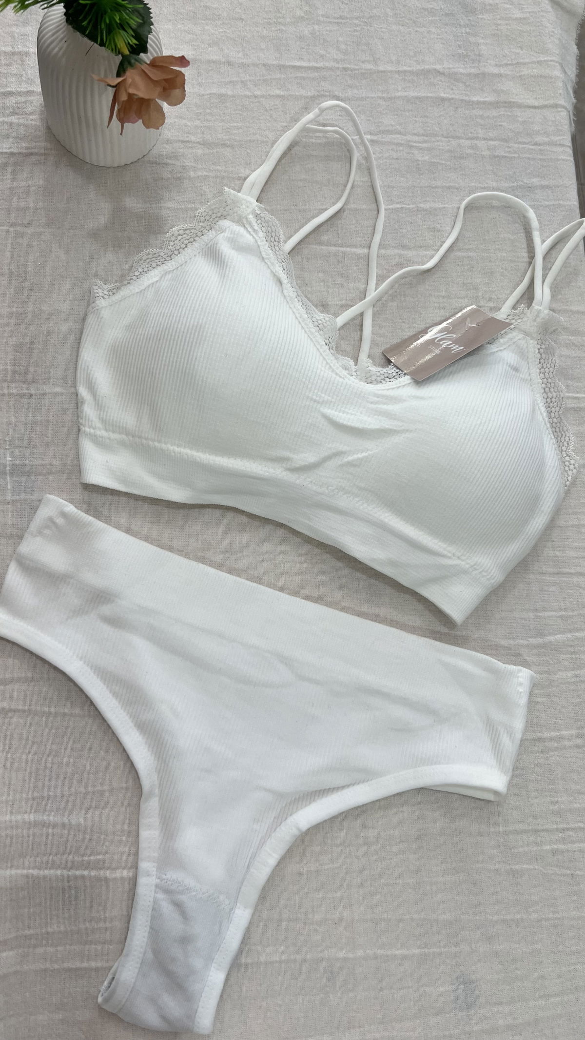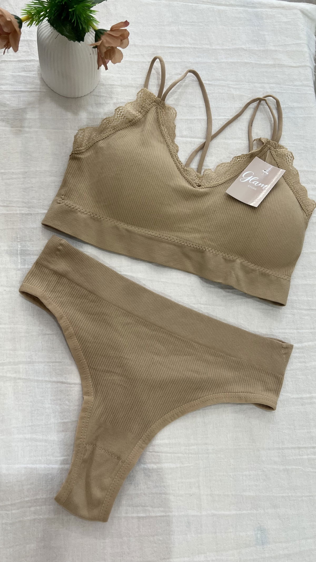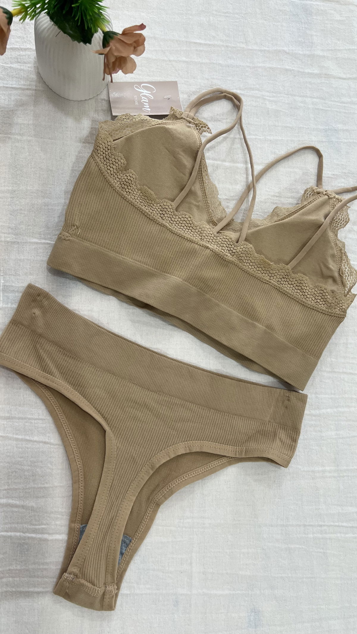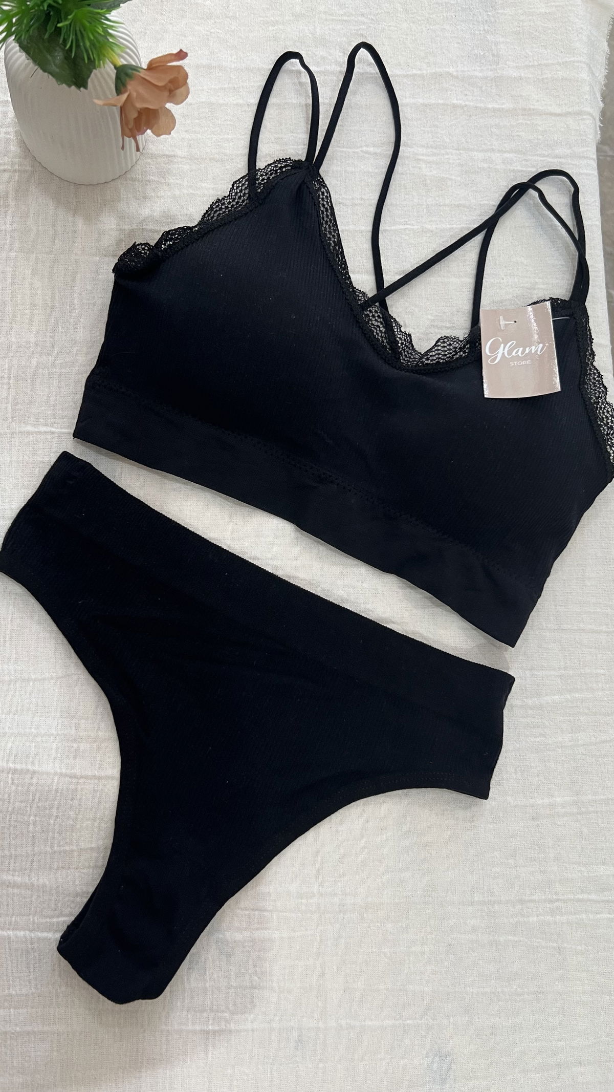 Conjunto de morley premium, top con tiras cruzadas en la espalda, detalles en puntillas, tasa sof desmontable y less tiro alto.