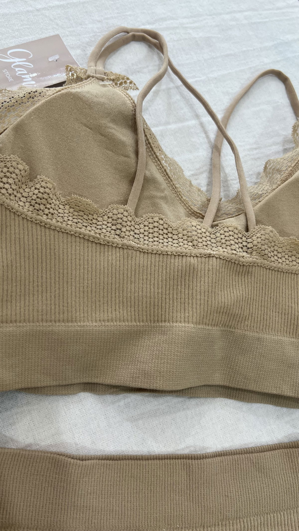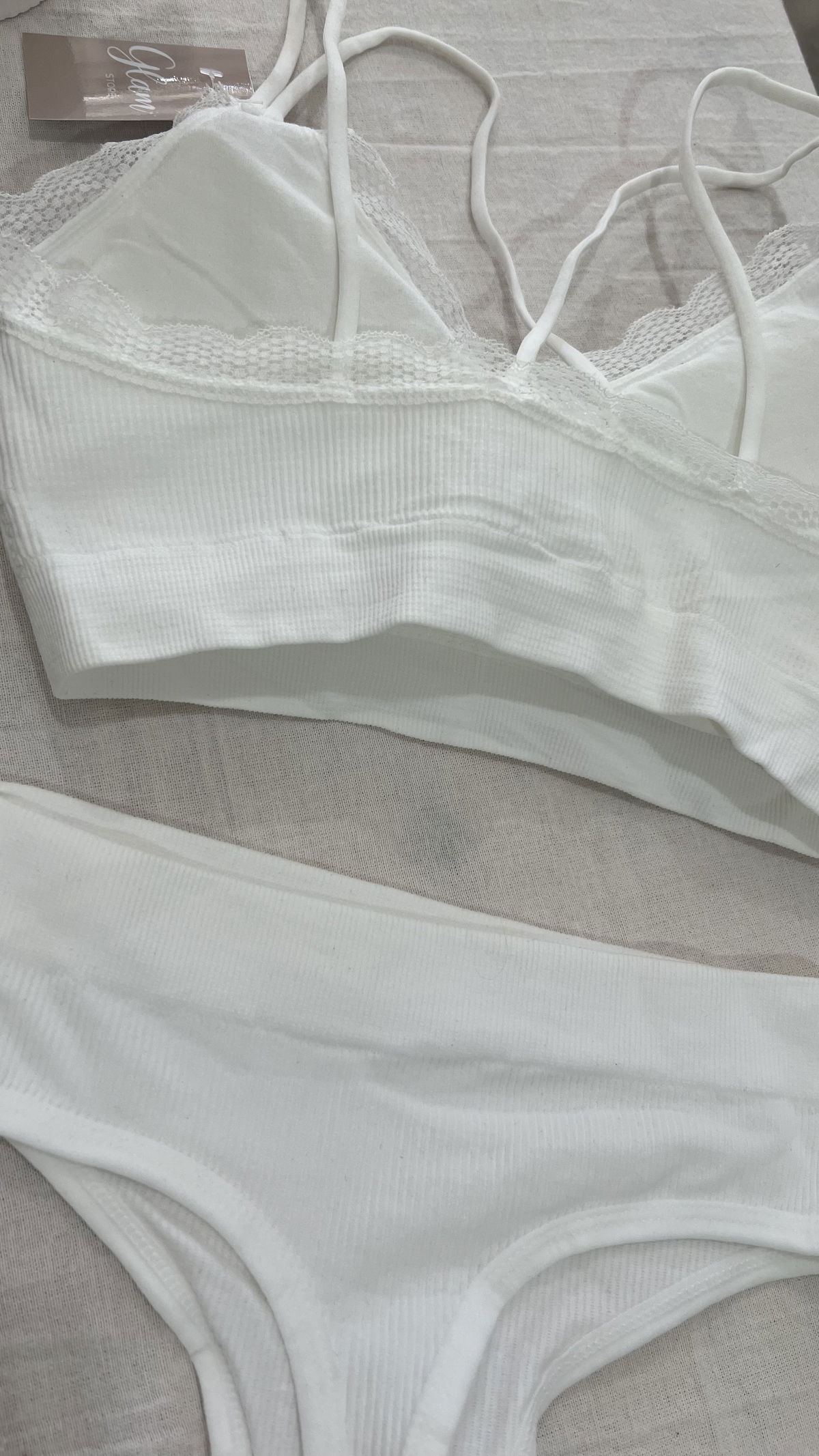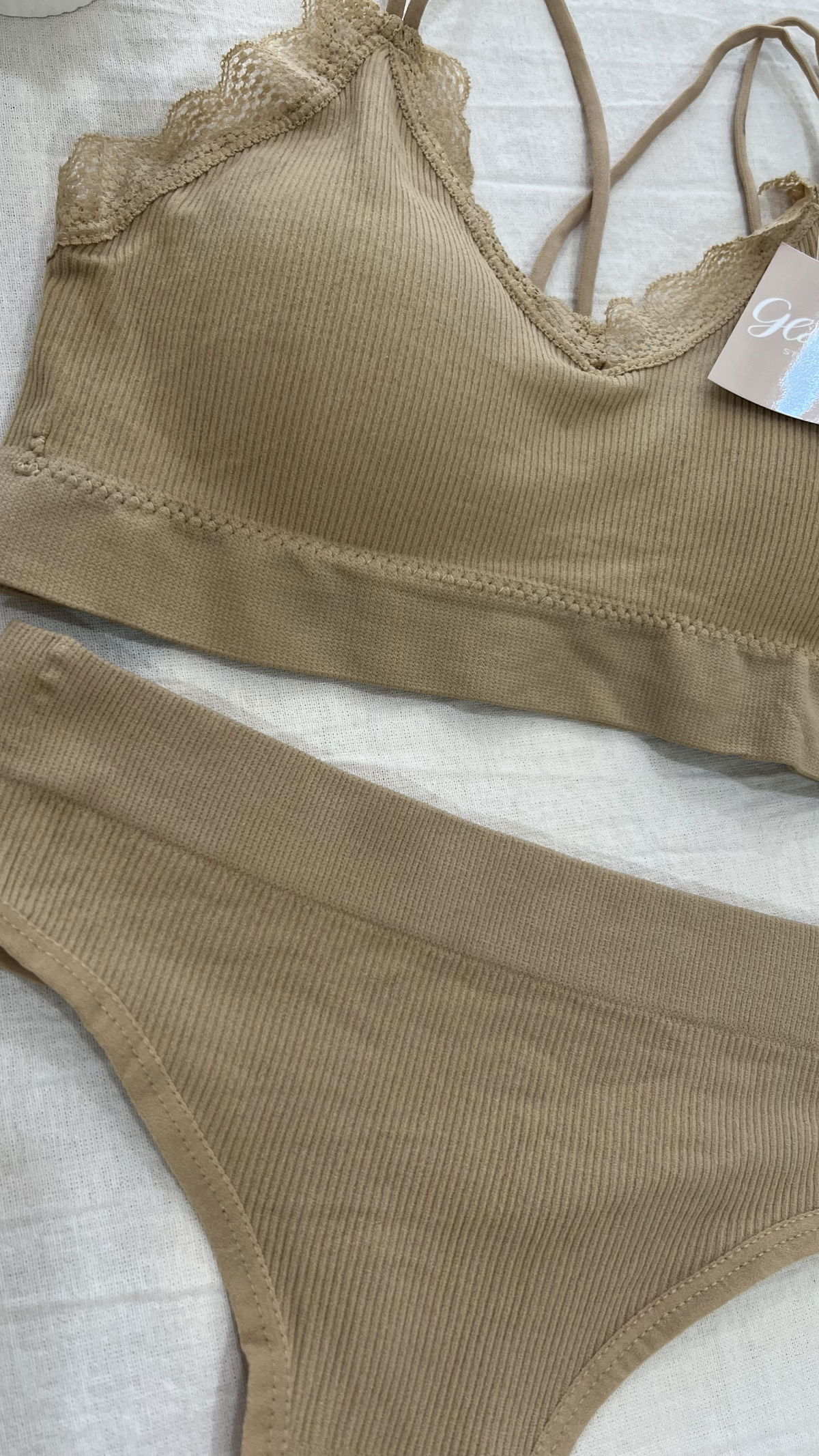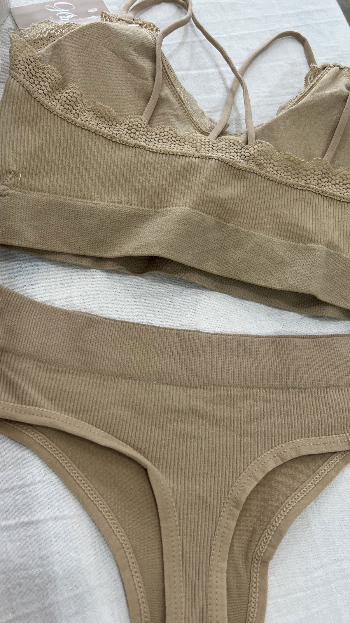 Conjunto de morley premium, top con tiras cruzadas en la espalda, detalles en puntillas, tasa sof desmontable y less tiro alto.